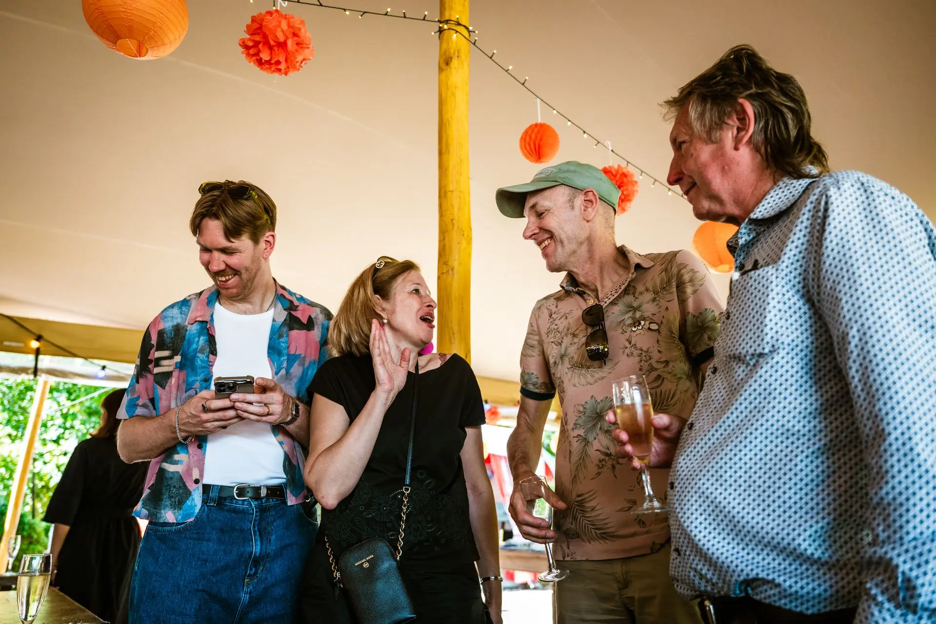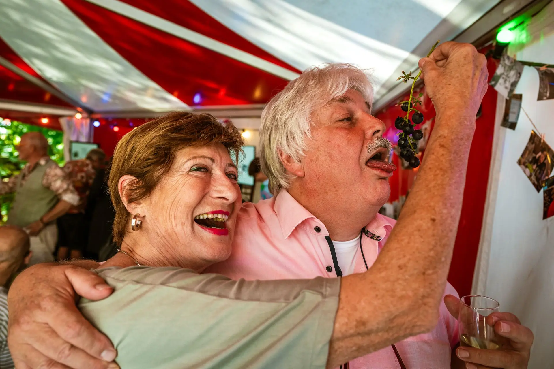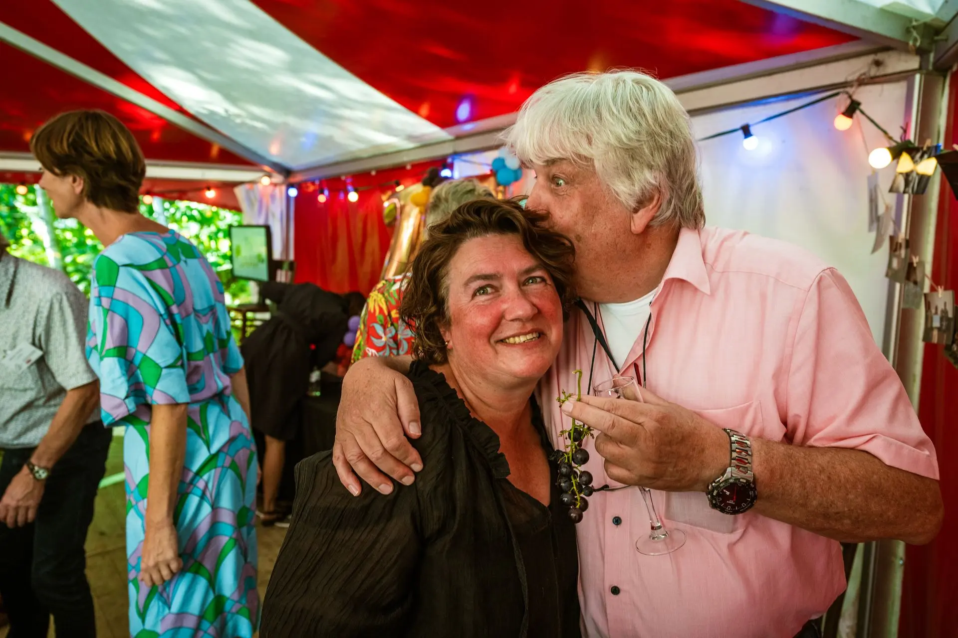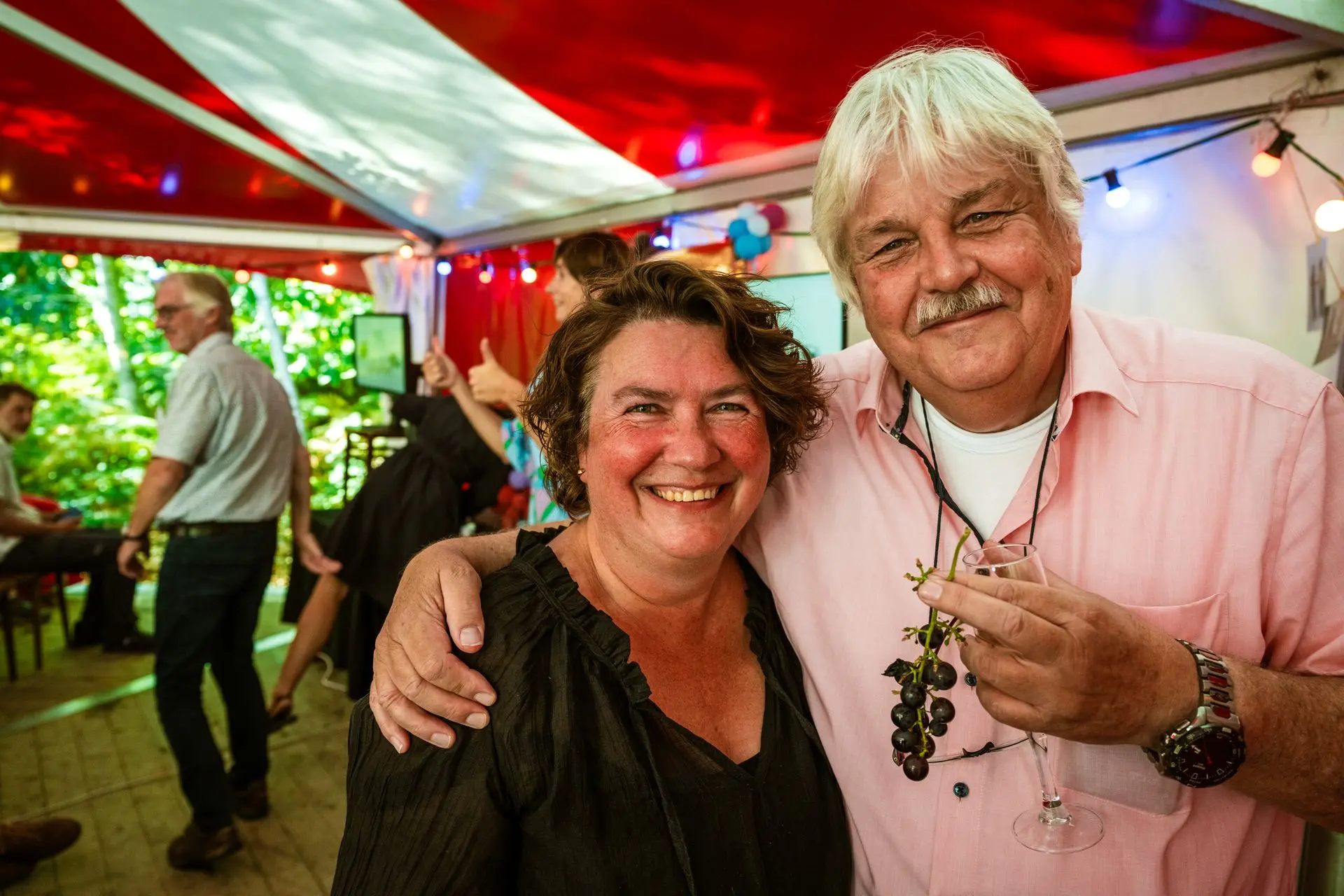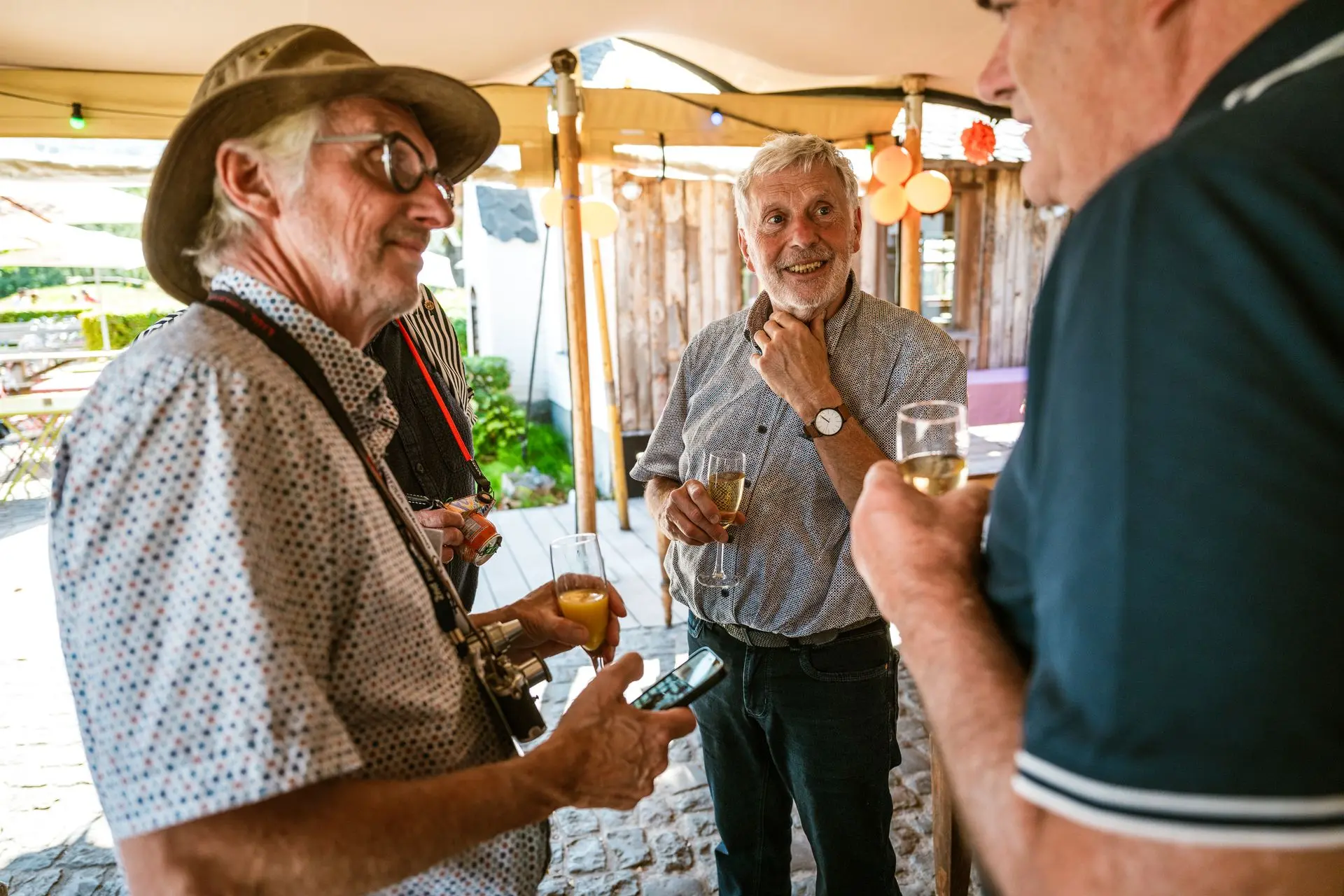 Onder een grote stretchtent aan het meer volgde het aperitief, met hartelijke weerzien en heerlijke hapjes. Overal hingen foto’s uit de rijke geschiedenis van de vereniging. Deelnemers doken in archieven met persartikelen en in de circustent kon men oude camera’s en de iconische beroepsfotografen-truitjes bewonderen. Fujifilm zorgde voor wegwerpcamera’s, zodat bezoekers analoog konden vastleggen zoals vroeger. Eizo voor schermen voor al het beeldmateriaal. En ook Canon en Nikon maakten hun officiële wensen over.